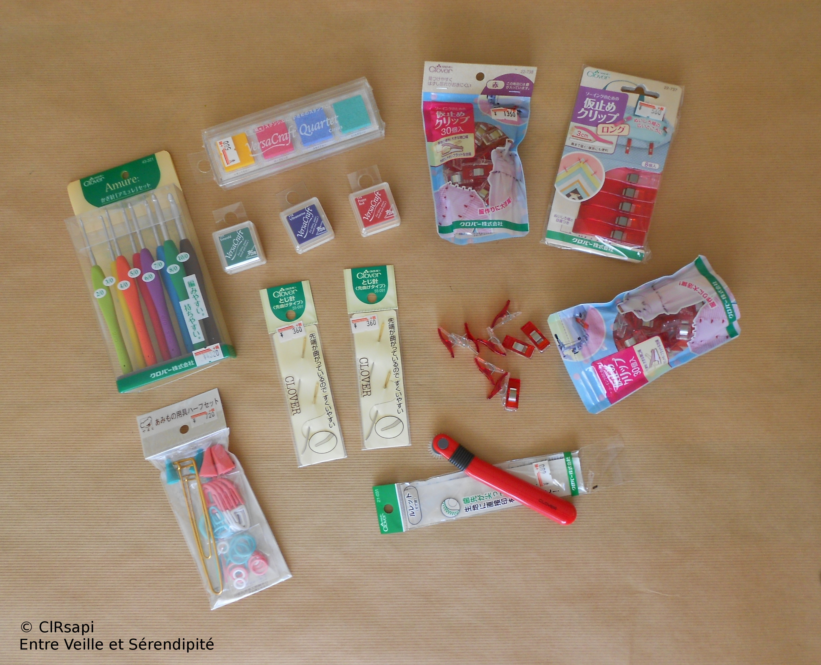 Et voici tout le matériel que j’ai rapporté : un lot de crochets Amour de Clover !! , des tampons spécial tissu, des pinces Clover de 2 tailles différentes, des aiguilles à laine Clover, une roulette pour patron Clover, et un lot de marqueur, embouts, … pour tricot. J’ai fait une petite razia, car les produits Clover sont moins cher au Japon (on ne paie pas les taxes de douanes 😉 ).