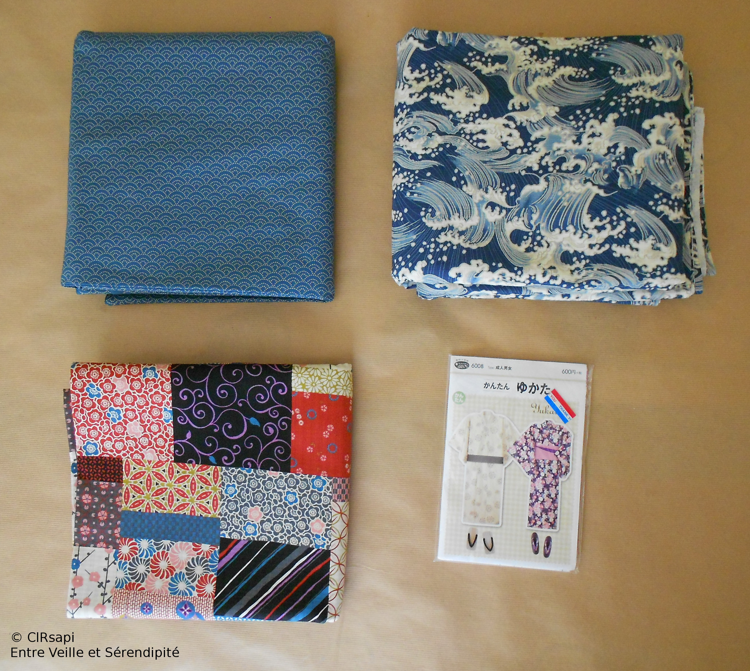 A Tomato, nous avons trouvé un patron pour faire des Yukata. Et donc, nous avons pris 3 coupons pour en faire (les 2 bleus pour mon Xamouraï, et le multicolore pour moi).