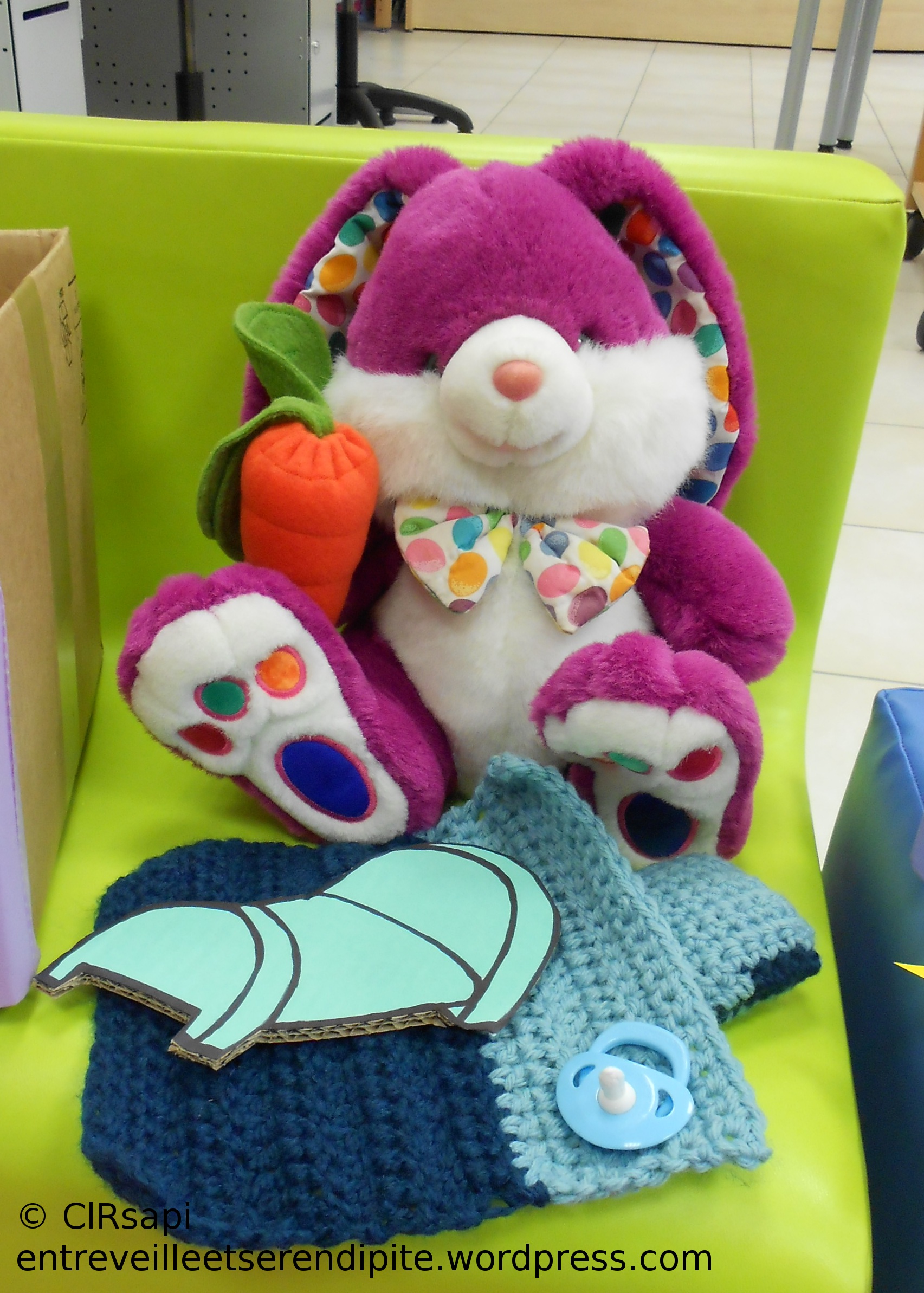 N’ayant pas de peluche lapin sous la main, j’ai fait appel à mes bénévoles, et il y en a un qui me convenait parfaitement, mais il n’était pas du tout ressemblant (vous trouvez pas qu’il a une bouille de lapin magicien ? ! !). On m’a même proposé un vrai lapin, mais bon les bébés auraient plutôt courir après, nan ? 😉