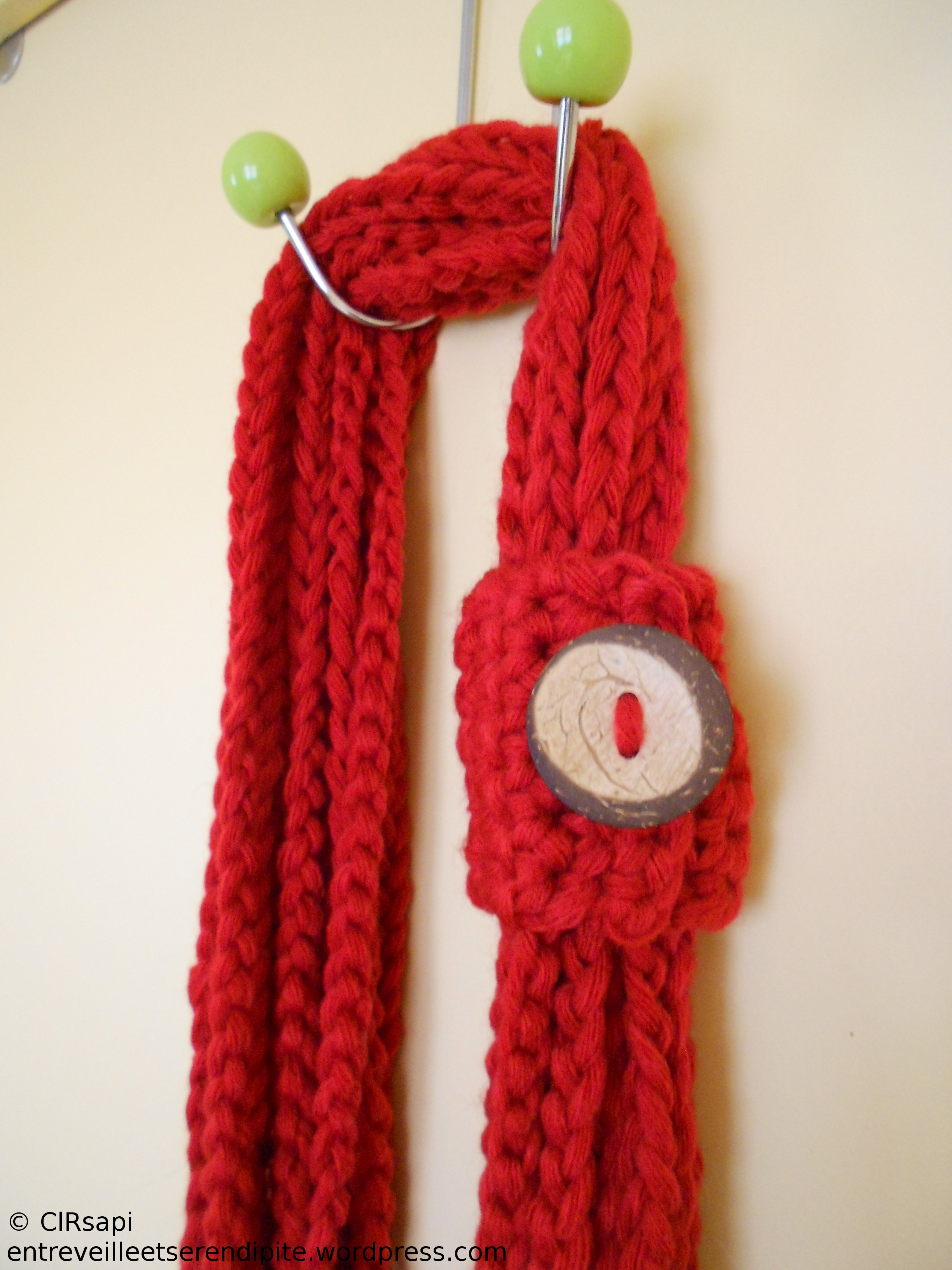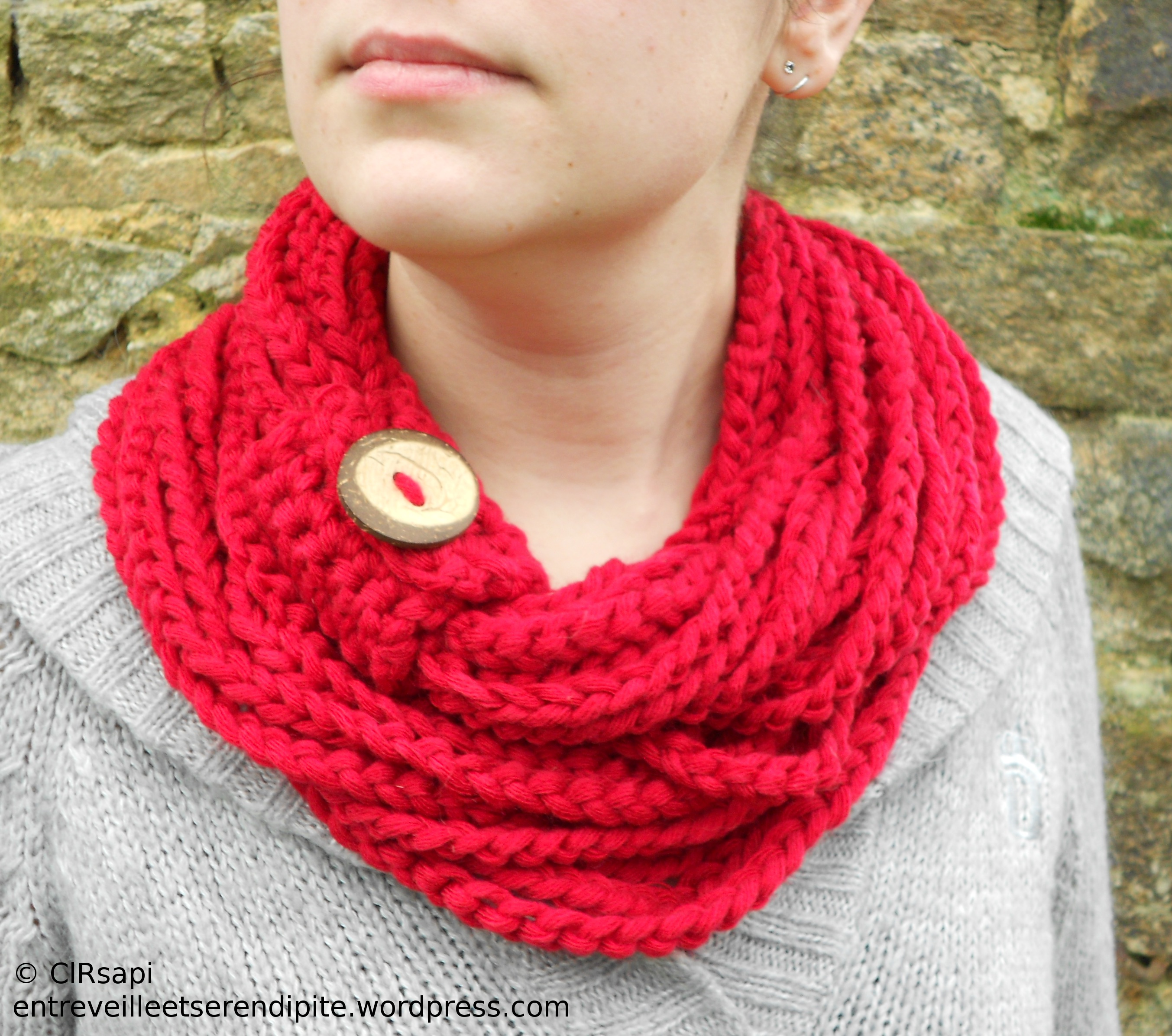 Mon Xamouraï m’a acheté des chaussures rouges, mais je ne porte pas de rouge !! (vous pouvez les apercevoir ICI). Afin de pouvoir porter ces chaussures sans qu’elles ne piquent trop les yeux, je me suis fait un petit snood que l’on pourrait qualifié de « filaire ».