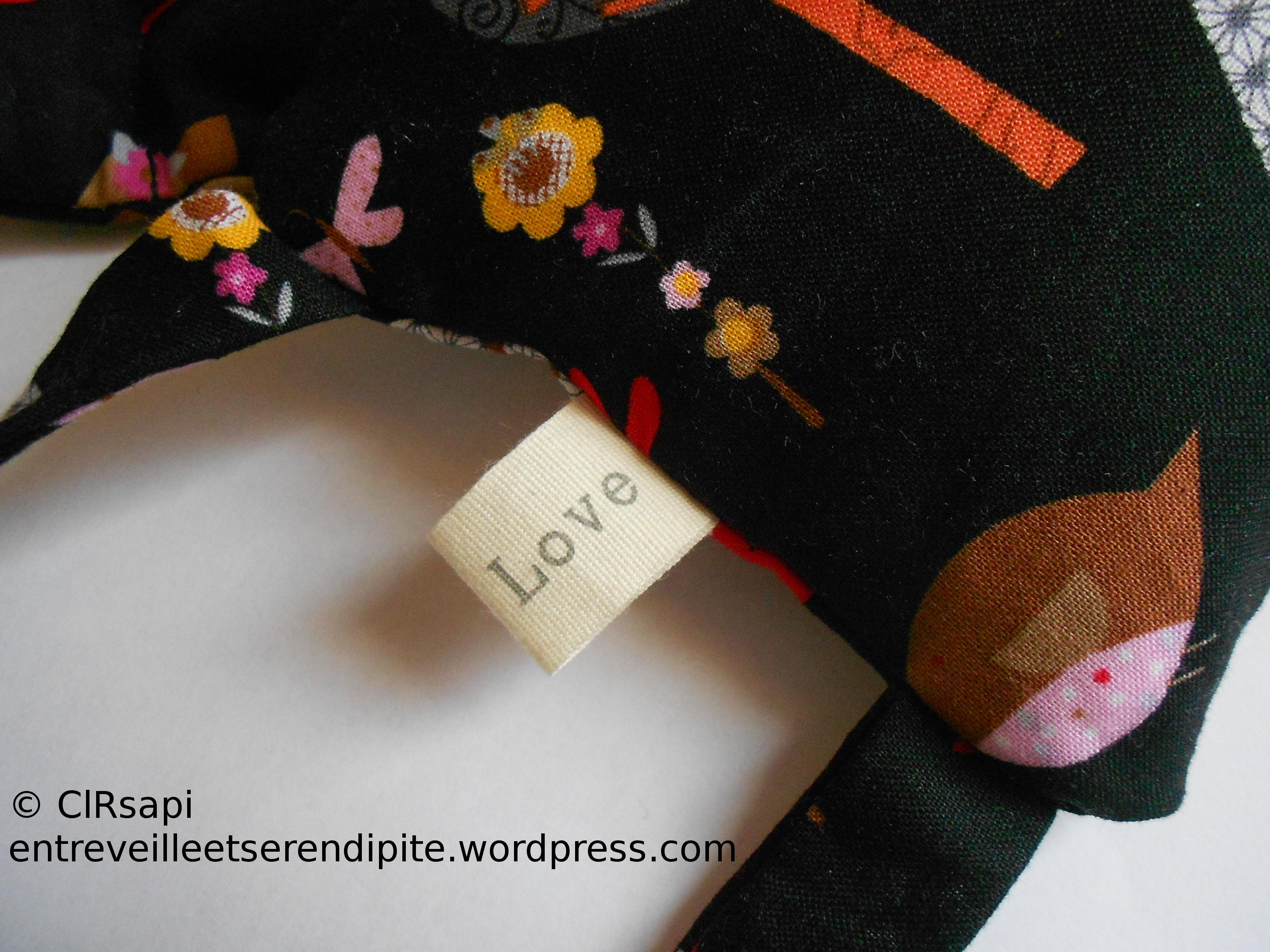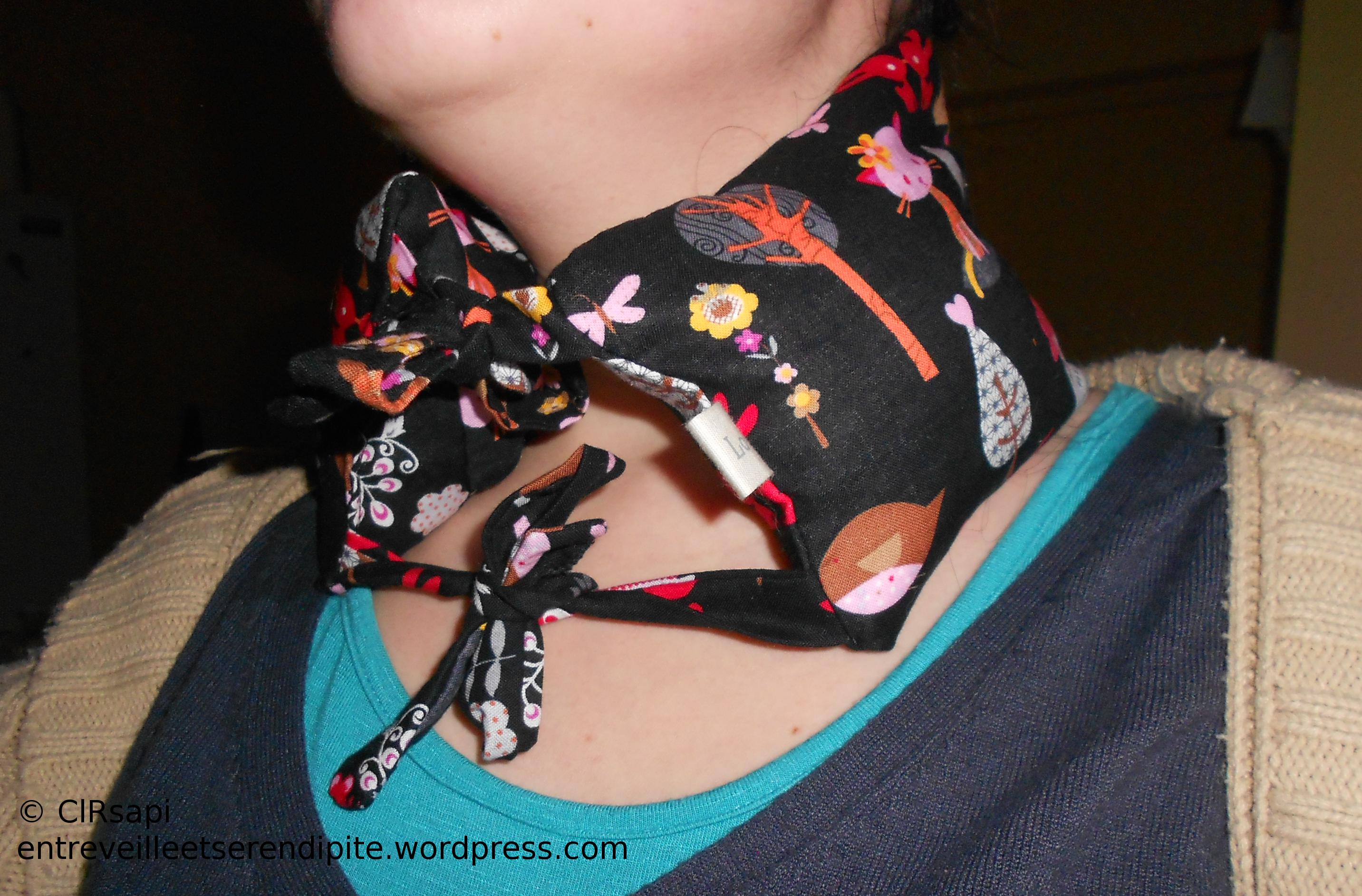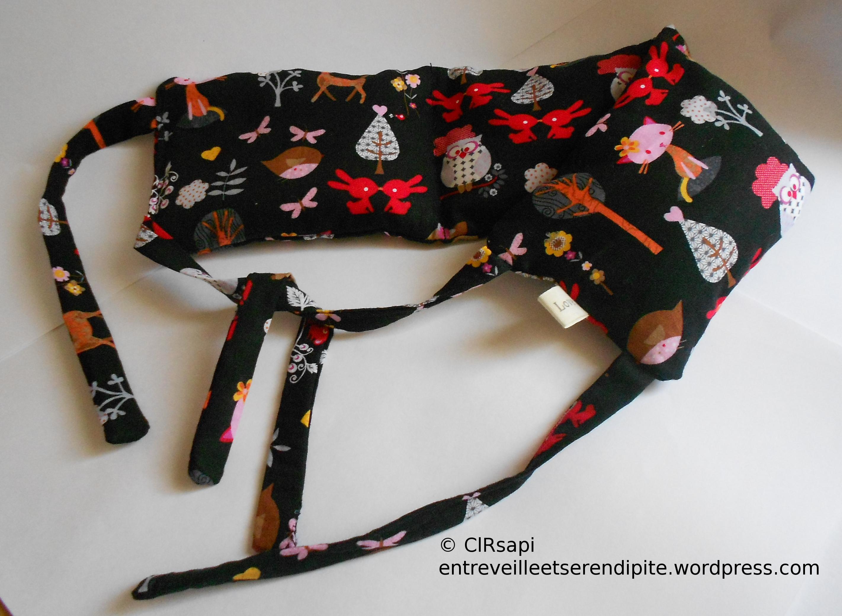– une nouvelle bouillotte sèche, façon Kallou, pour moi ! Cette fois-ci, j’y ai mis du blé au lieu du riz. Il me reste plus qu’à voir quelle céréale tient le plus longtemps chaud !! En tout cas elle est très agréable à porter ! ! (tissu acheté chez Tissus Myrtille, vu aussi à Diffus’Laine Tissus)