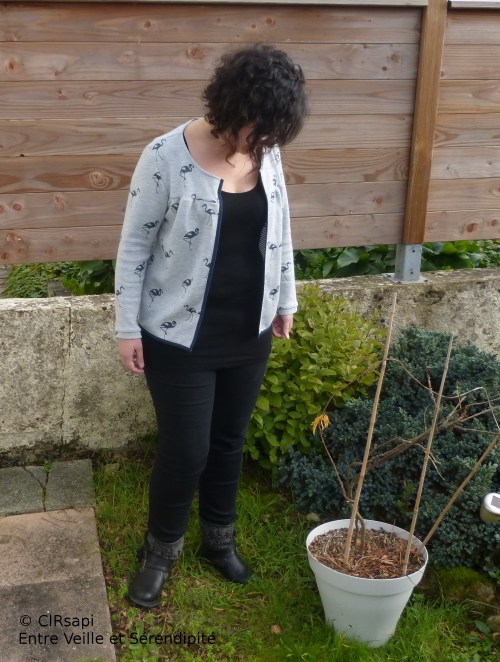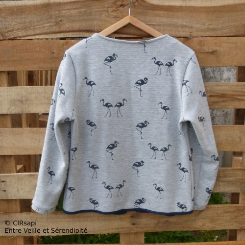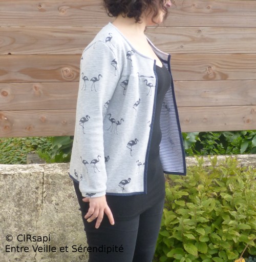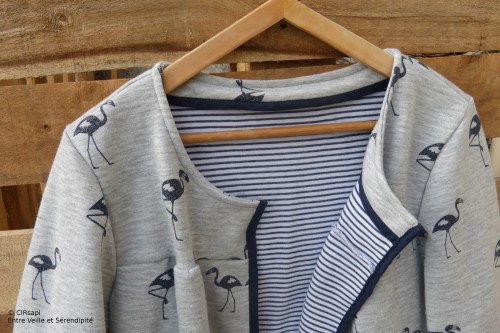 J’ai tout d’abord eu un coup de coeur pour un joli tissu réversible, avec de jolis flamants bleus qui brillent (j’avoue, on ne le voie pas sur les photos, mais ils sont plein de paillettes ! Et dire que je n’ai pas trop les truc kibrillent, enfin bref !), je l’ai toute suite imaginé dans un gilet ou une veste. Le choix du patron n’a pas été facile (surtout que j’étais un peu juste niveau tissu), mais j’ai fini par m’arrêter sur celui de la veste Adèle de Super Bison.