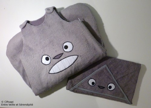 L’hiver dernier, ma meilleur amie m’a demandée de coudre pour son futur bébé une gigoteuse et une cape de bain. Comme nous sommes toutes les deux fan de Totoro, le thème s’est presque imposé à nous.